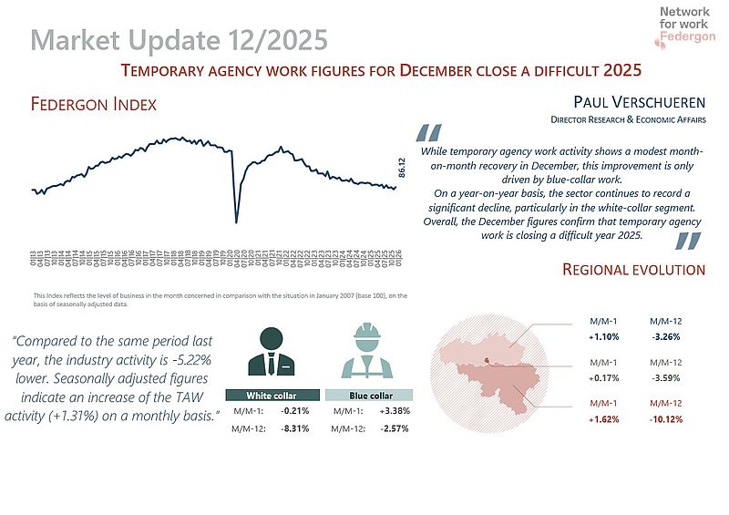 In december 2025 steeg het aantal gepresteerde uren uitzendarbeid met +1,31% ten opzichte van de vorige maand (op basis van voor seizoens- en kalenderinvloeden gecorrigeerde cijfers). Dit cijfer is toe te schrijven aan een uiteenlopende evolutie in beide segmenten: het aantal gepresteerde uren daalde met -0,21% in het bediendesegment en steeg met +3,38% in het arbeiderssegment.