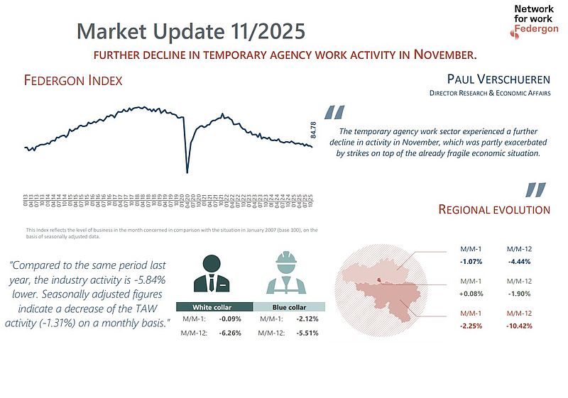 In november 2025 nam het aantal gepresteerde uren uitzendarbeid af met –1,31% t.o.v. de vorige maand (op basis van voor seizoens- en kalenderinvloeden gecorrigeerde cijfers). Deze achteruitgang is toe te schrijven aan een negatieve evolutie in beide segmenten: het aantal gepresteerde uren nam af met -0,09% in het bediendesegment en met -2,12% in het arbeiderssegment.